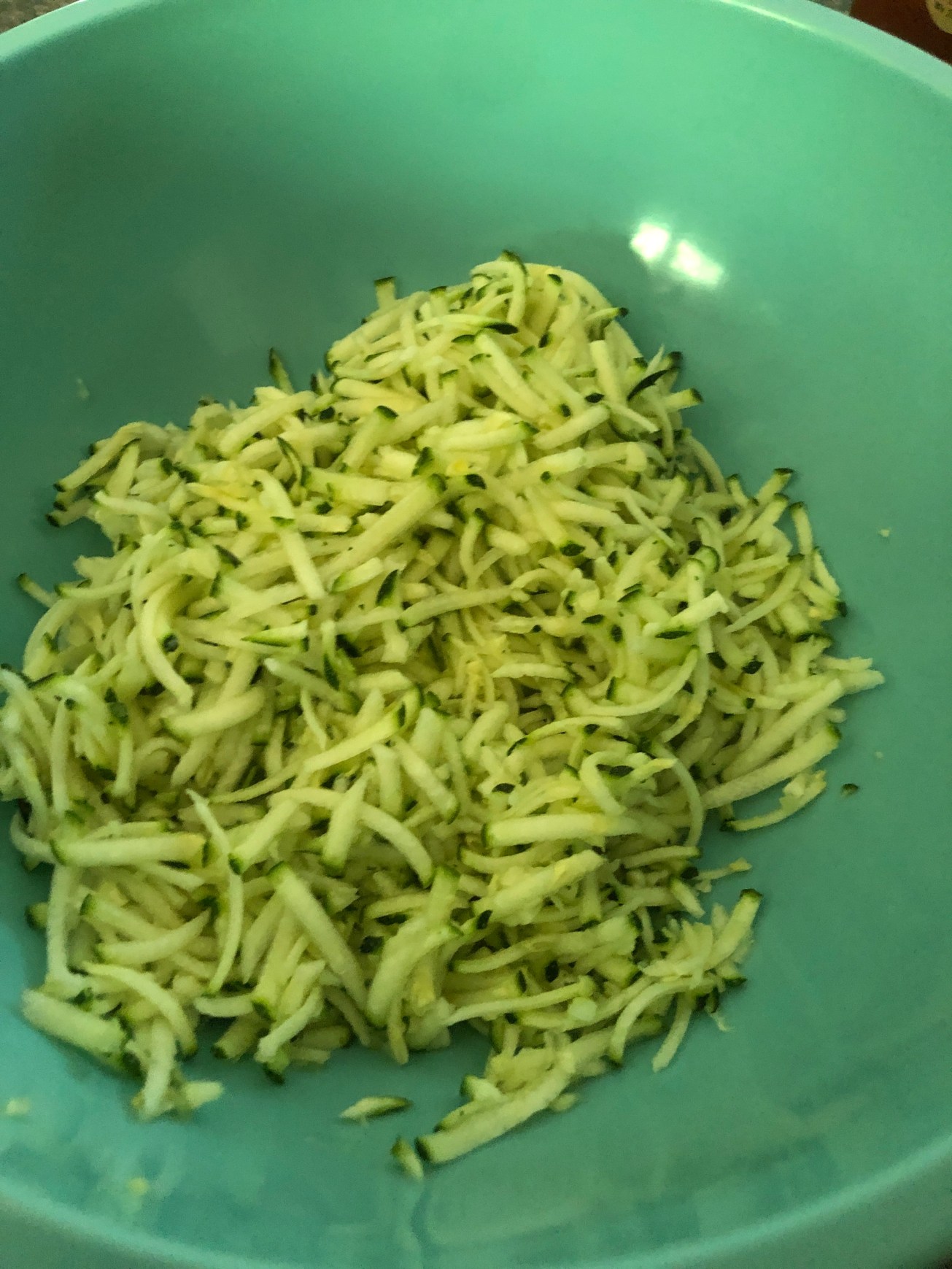 -Combine all the ingredients into a large bowl and mix everything together (it may look clumpy and then soupy-depends on water in zucchini)