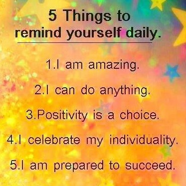 Say these OUTLOUD to yourself!! Sure if you do it in the middle of a crowd someone may turn and look at you like ‘what are you saying ‘ BUT if you do it driving home from work, while on a break, or before bed “POSITIVE THOUGHTS attract POSITIVE ACTIONS” –the key is to believe in yourself!! No one will believe in you if you don’t radiate the belief in yourself!! 😉