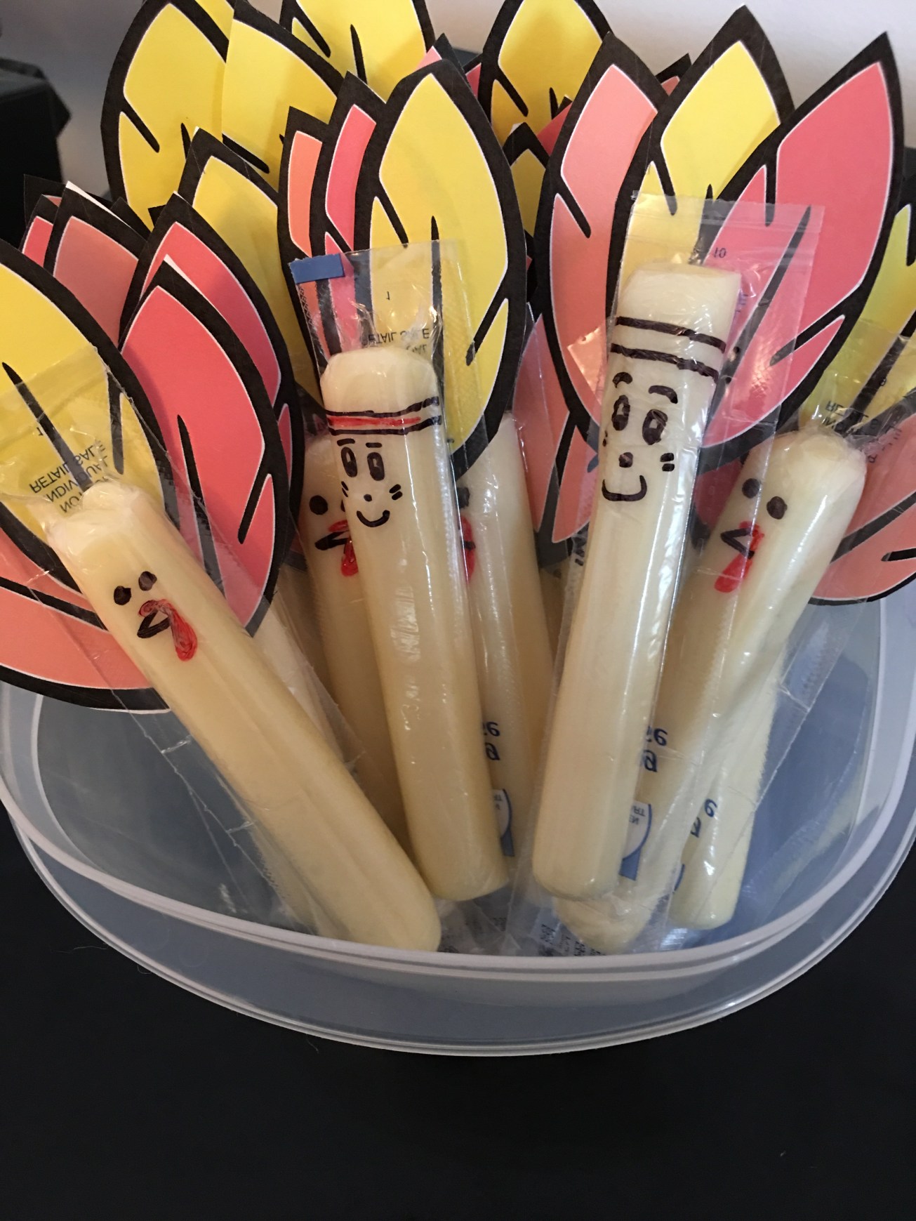 Print out feathers and color OR use construction paper. Tape together and tape toback of cheese stick. Use marker to make faces on front π