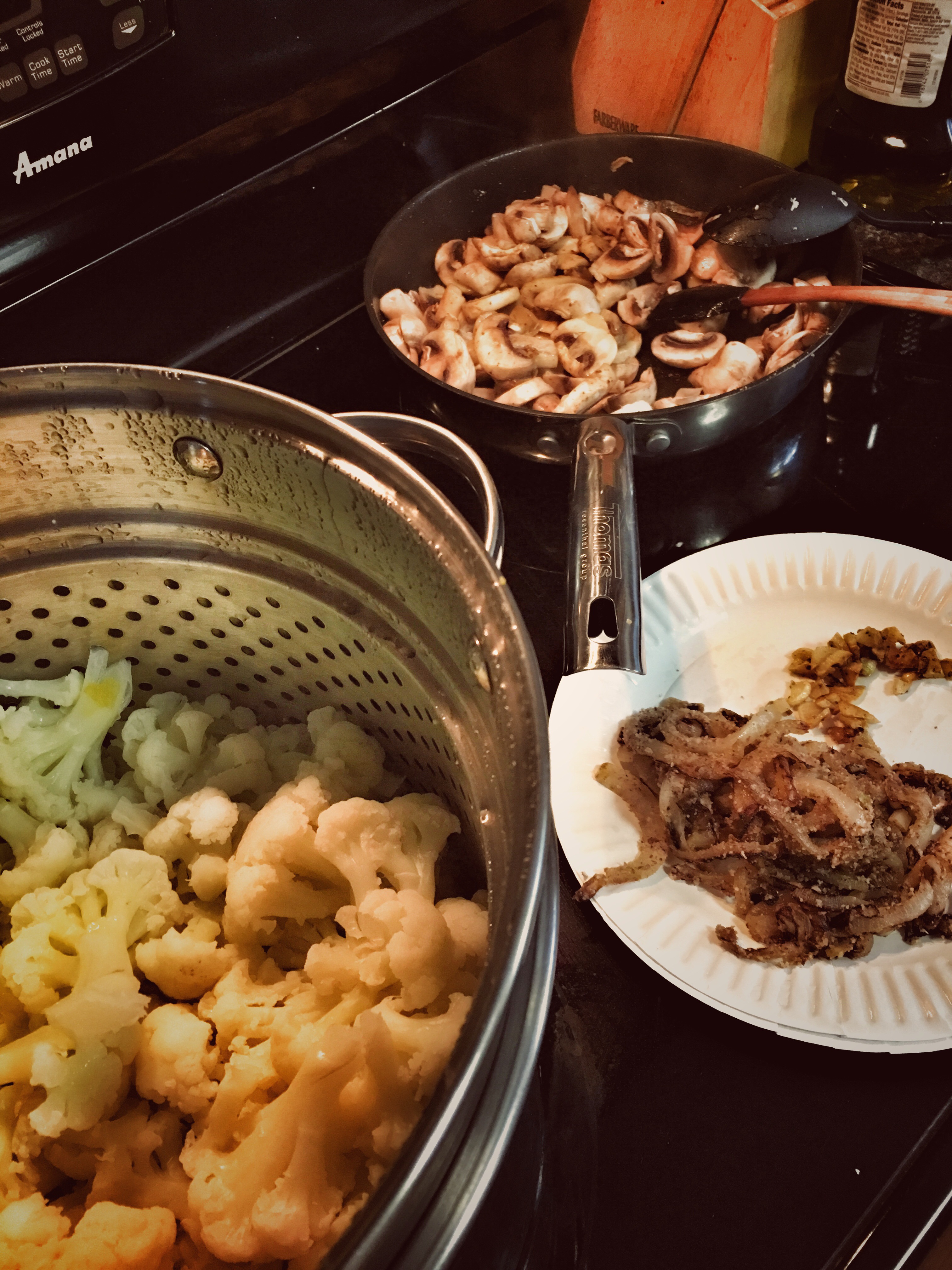 Purée garlic and cauliflower to make a sauce. Add 1 cup of unsweetened cashew milk –adding more as needed to desired sauce consistency. Once sauce made add to pan if mushrooms. Add salt, pepper, other seasoning powders of choice to desired taste.