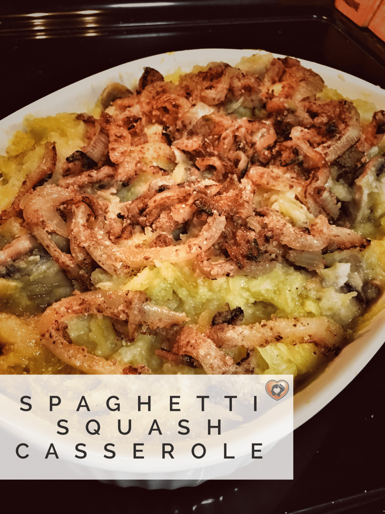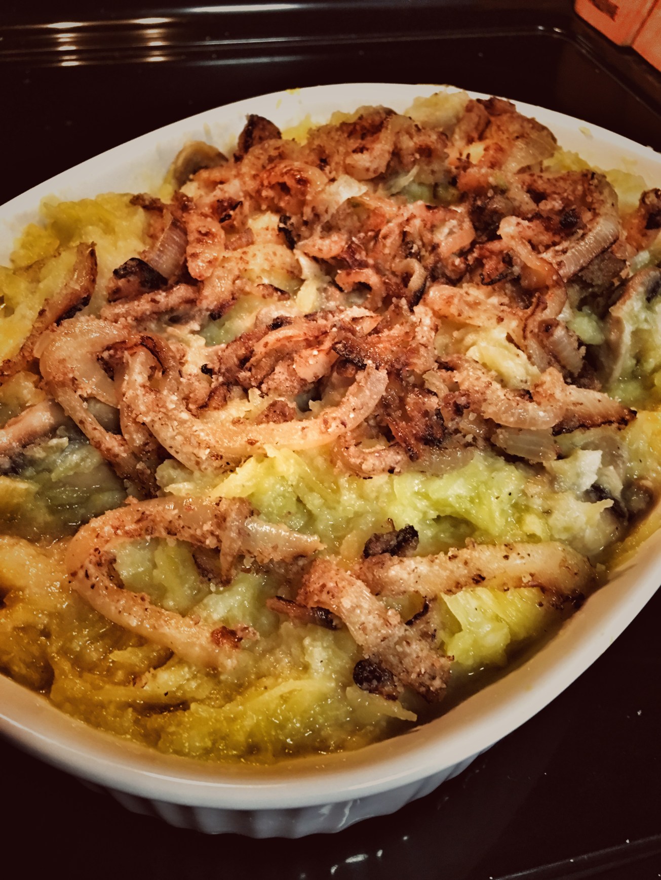 Once mushrooms and sauce mixed well, mix with spaghetti squash and add to casserole dish. Top with onions and place in oven to reheat and toast up the onions on top.