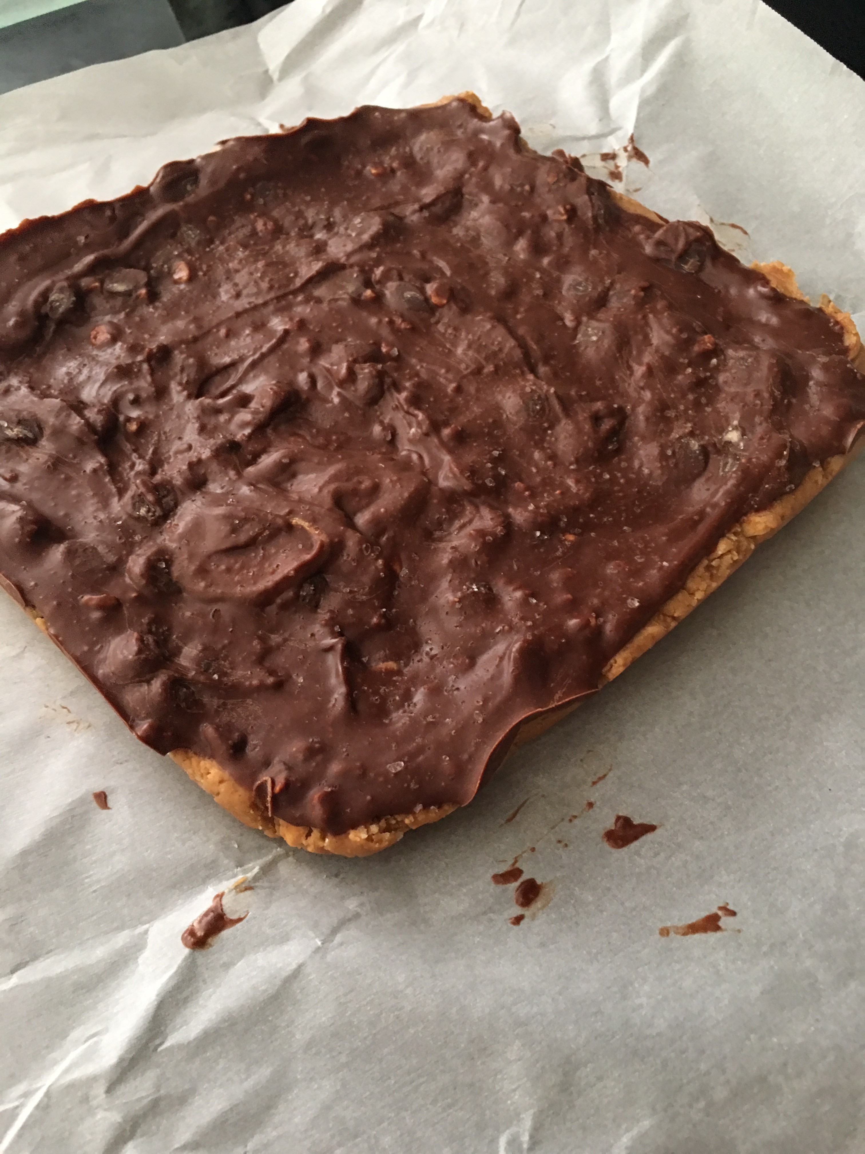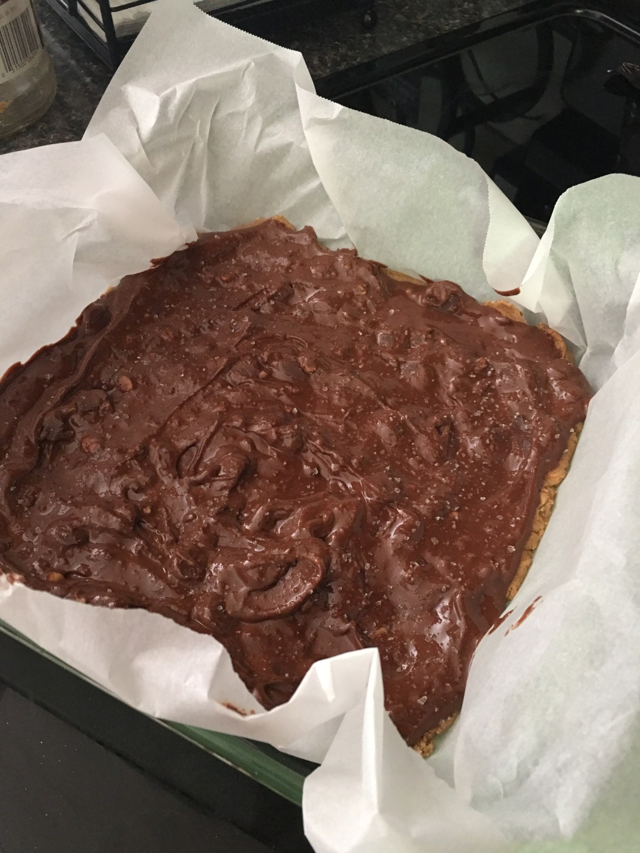 -Place in freezer for 45minutes. Once finished in freezer pull parchment paper out of dish and cut into squares.