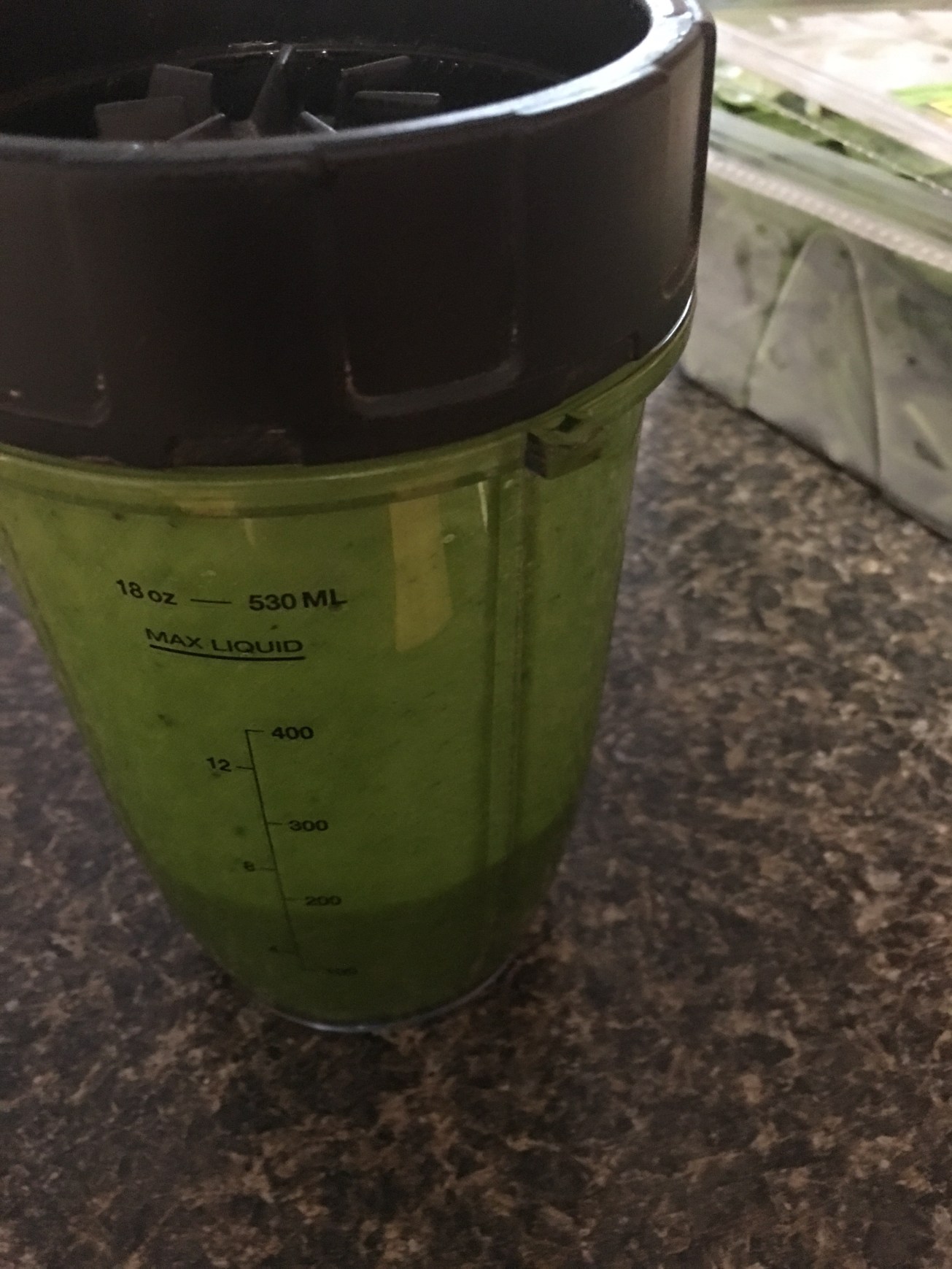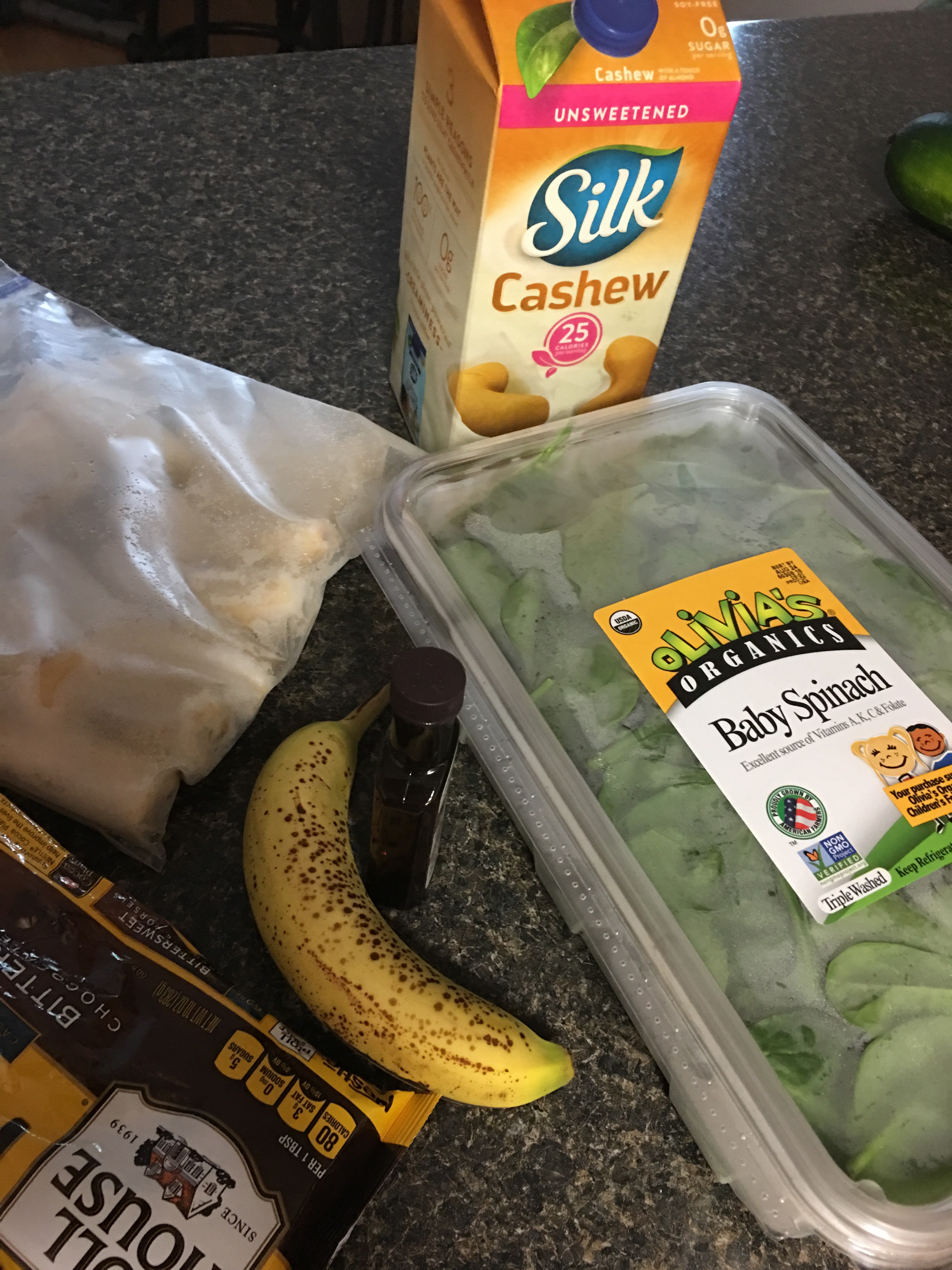 In separate cup blend 4oz Unsweetened Cashew Milk, Cup of Spinach, & 1 Banana (not frozen), 1/2 tsp of flavor extract (vanilla & mint) **CAREFUL on the mint— if you add to much it’s not very palatable—it’ll taste like toothpaste**