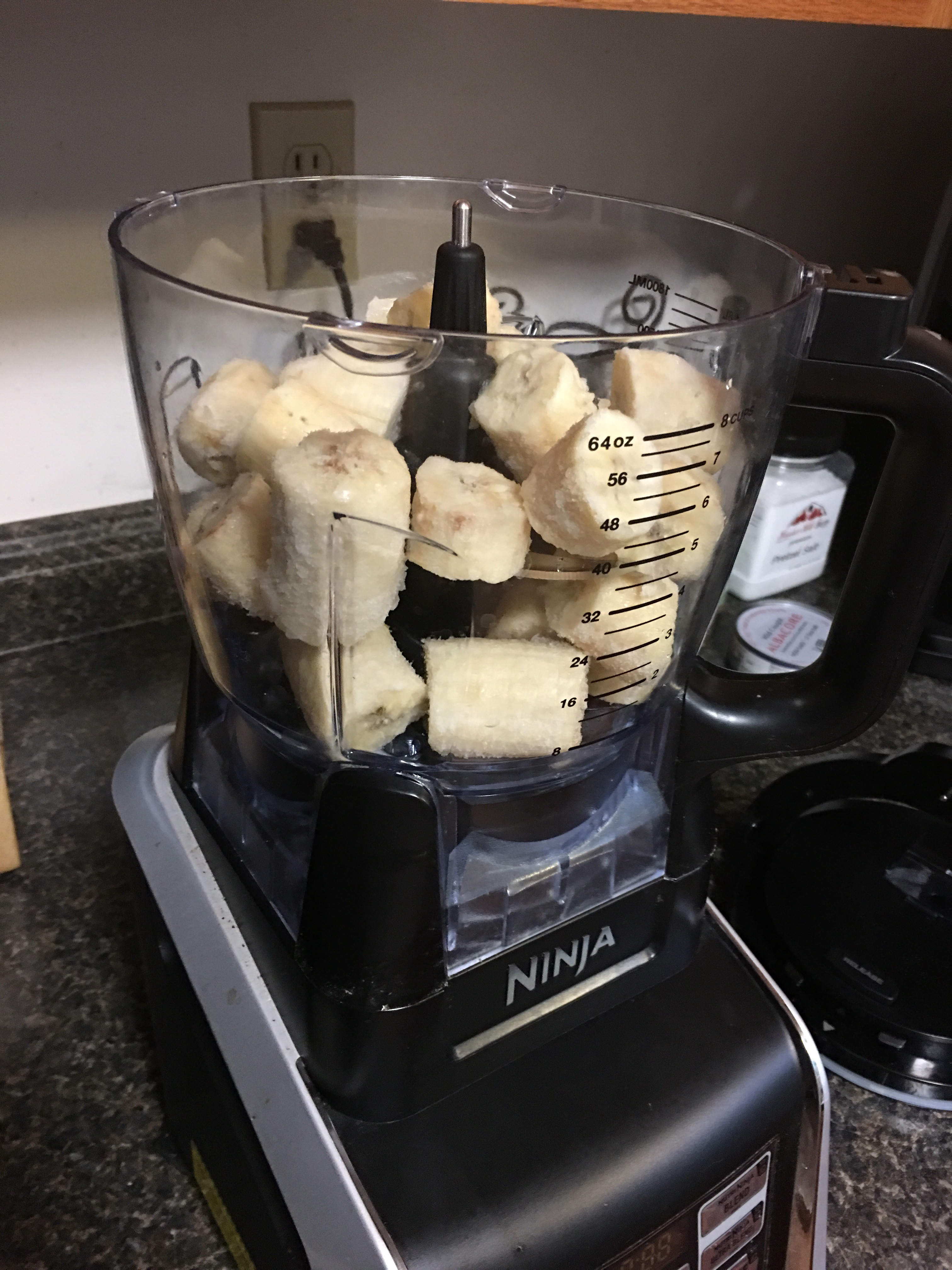 -Place frozen banana pieces in processor and process until it becomes almost “breadcrumb” looking.