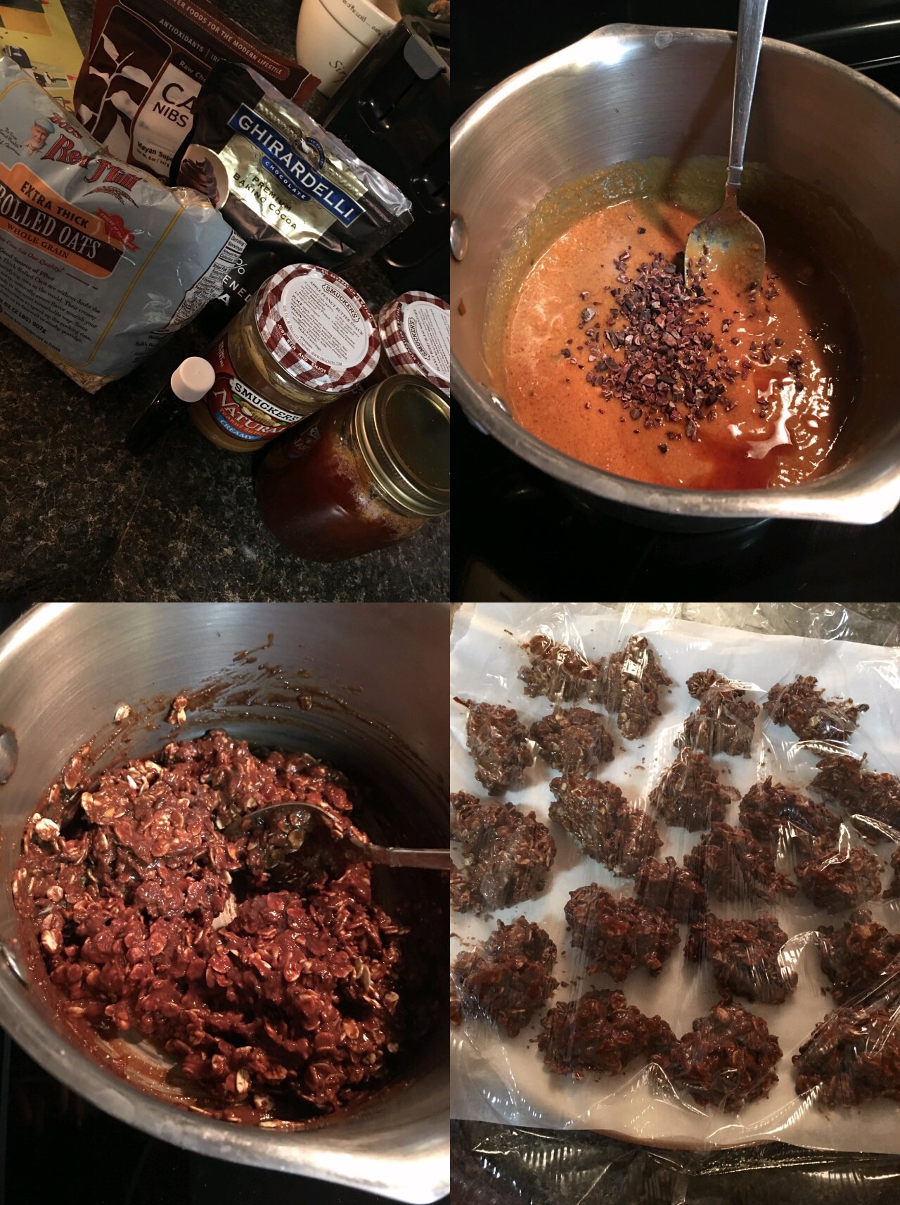 Combine peanut butter, honey, & coconut oil in pan and slowly warm and stir together. Once melted & combined add vanilla, cocoa nibs, cocoa powder, and oatmeal.