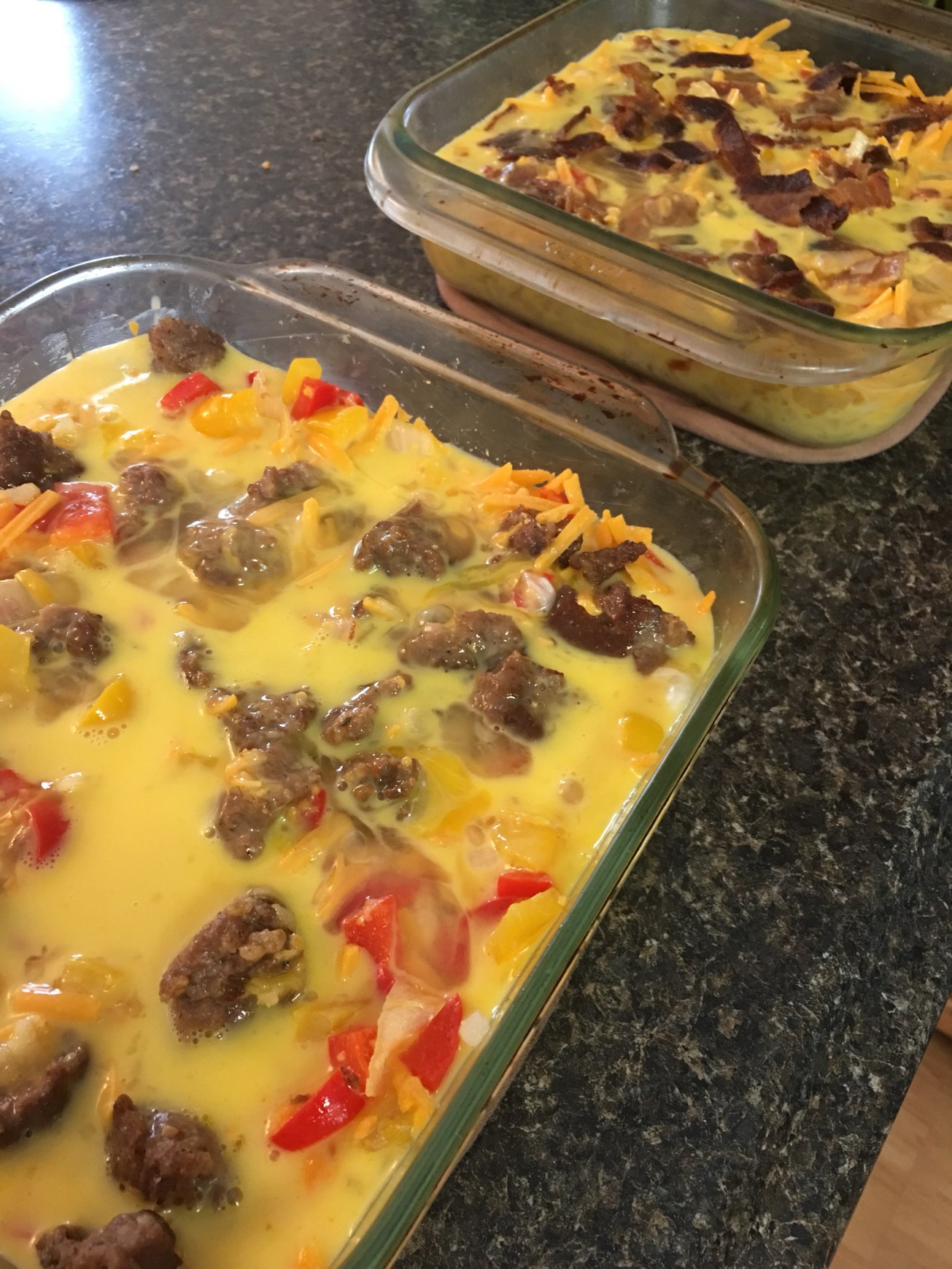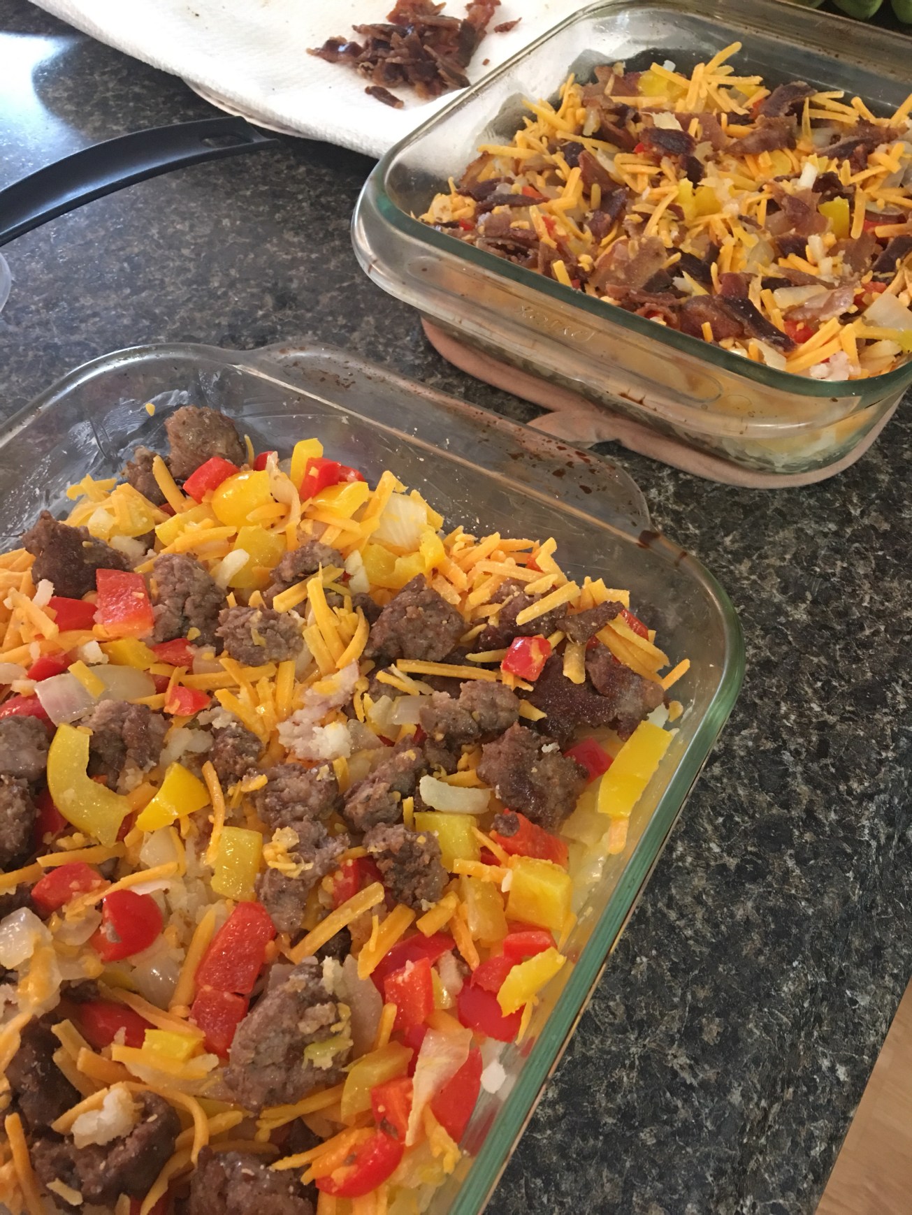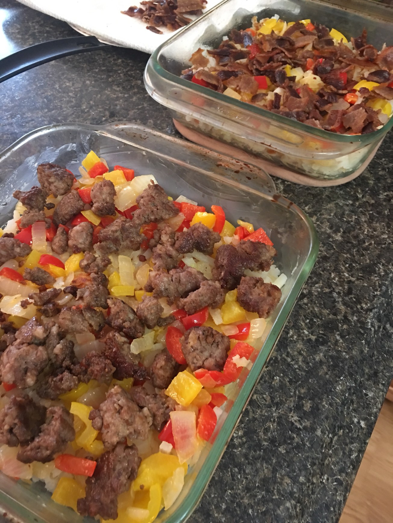 Greased 2 baking dishes – split hash browns and veggies between two dishes. Add bacon to one. Sausage to the other. Mix in some handfuls of cheese. Mix eggs and add milk (mixed by eye – didn’t measure). Poured over two dishes – enough to cover (with some of the goodies still popping through)