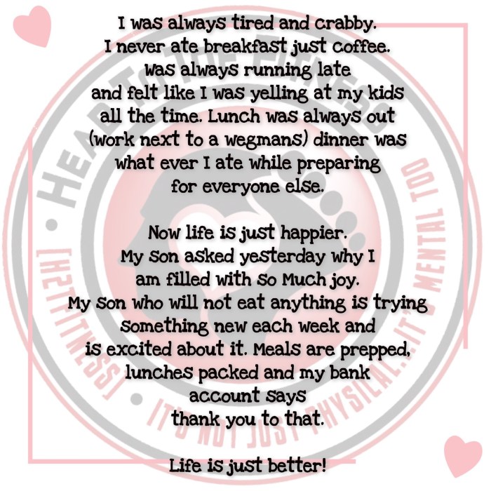 I HAVE to share this post from one of my lifers!! She joined a challenge of mine and is still going strong BECAUSE of the lifestyle choices she made and continues to make. –>THIS IS WHY<– I LOVE being an online Health and a Fitness […]